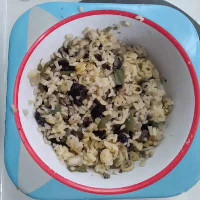 Papinha de macarrĂŁo, feijĂŁo, carne e vagem